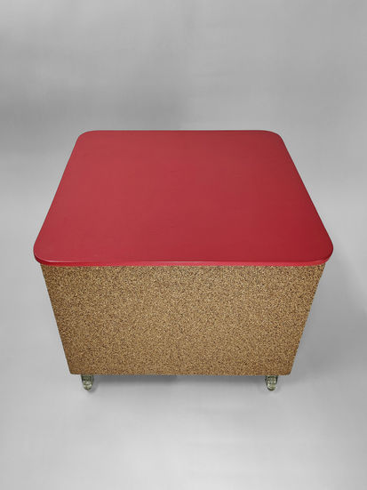 This is a redesigned and renovated wheeled table using upcycled materials and second hand furniture.